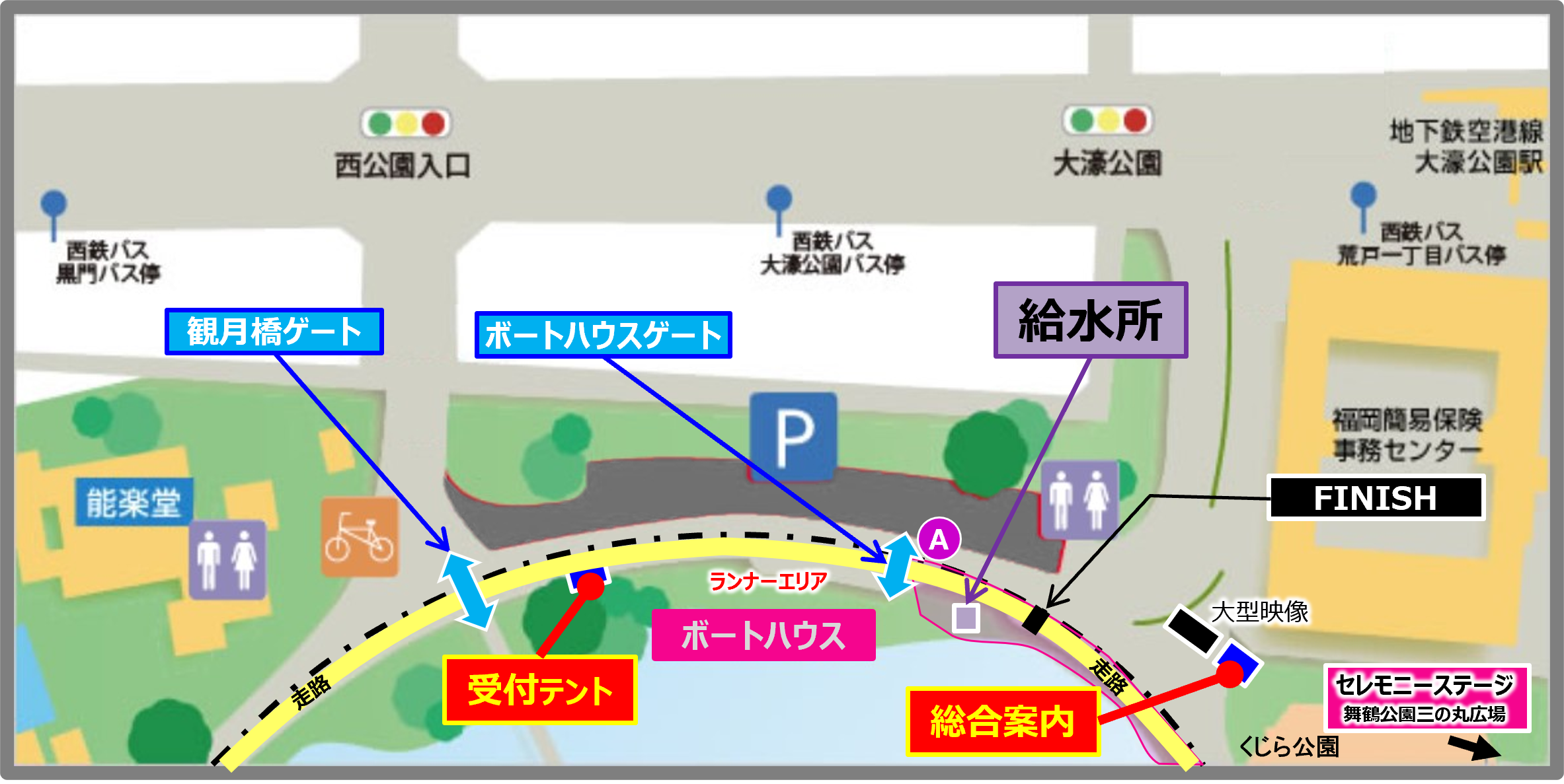 ※2 制限時間を超えた場合は、レースを中断し、歩道(池)側にコースアウトしていただきます。